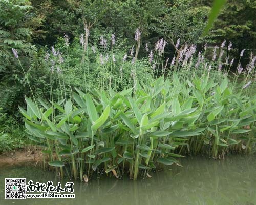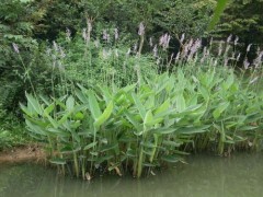 多年生挺水草本。叶卵状披针形,浅灰蓝色,边缘紫色,长50cm,宽25cm。复总状花序,花小,紫堇色。全株附有白粉。温带地区是一种优秀的温室花卉,花柄可高达2米以上。