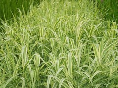 多年生挺水草本观叶植物。株高1.5 ~2.0m。宿根,地下根状茎粗而多结,地上茎由分蘖芽抽生,通直有节,丛生,叶互生,斜出,排成二列,披针形,弯垂,灰绿色具白色条纹,叶端渐尖,叶基鞘状,抱茎,圆锥花序顶生,大型羽毛状。花期10月。