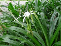 水鬼蕉,多年生草本。有鳞茎。叶数枚,集生基部,抱茎;剑形,长45~75厘米,宽2.5~6厘米,深绿色,多脉。花茎扁平,实心,高30~80厘米,外苞片长5~7厘米,基部极阔;花白色,无柄,3~8朵生于花茎之顶;花被管圆柱形,纤弱,长短不等,约10厘米以上,裂片线形,常短于管;雄蕊生于管之喉部,花丝基部合成杯形,上部分离,花药丁字着生;子房下位,花柱头状。花期夏末秋初。叶剑形,端锐尖,多直立,鲜绿色,长50—80ca,宽。一6ca。花葶扁平,高30一?Ocm;花白色,无梗,呈伞状着生;有芳香;花筒部长短不一,带绿色;花被片线状,一般比筒部短;副冠钟形或阔漏斗形,具齿牙缘。鳞茎径7—11cm。为庭园栽培植物。
