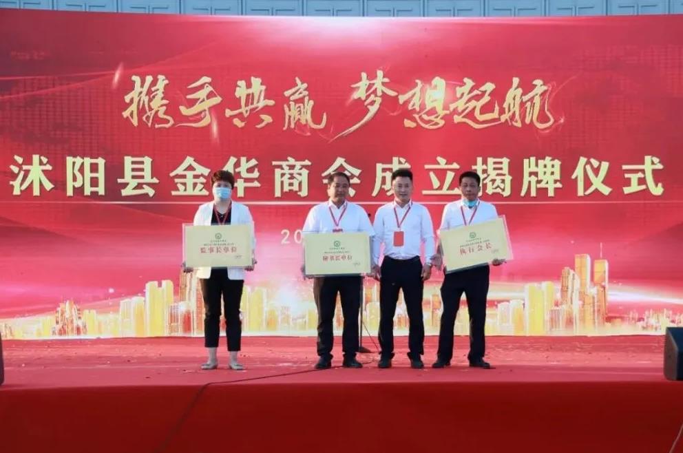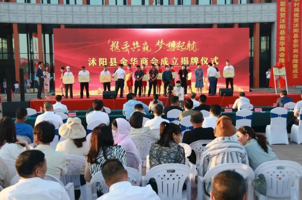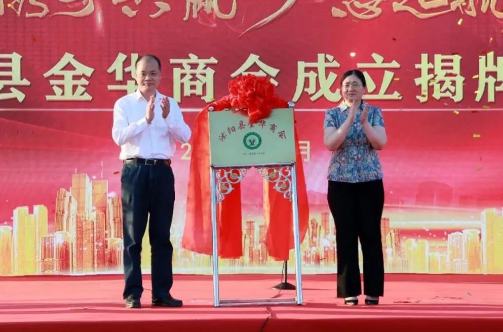 5月26日,沭阳县金华商会成立揭牌仪式在沭阳国际花木城举行。县委常委、统战部部长寇建东,县政协副主席、县工商联主席王雪梅到场并为商会揭牌。