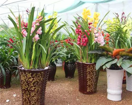 【大花蕙兰】颜色:金黄色,豆沙红,寓意:财源广进万事大吉