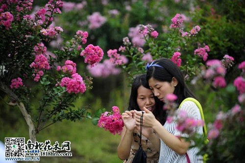 两位美女在紫薇丛中拍照留念(图片来自新华网)